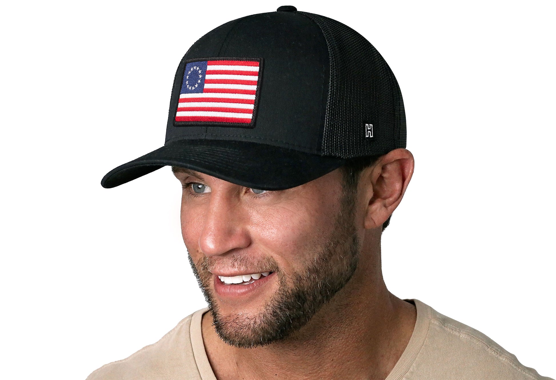 Rep the USA in style with the HAKA Betsy Ross Flag Trucker Hat, featuring a premium USA embroidered flag patch on our black signature 5.0 trucker.